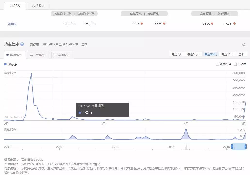 2015年5月8日,京东发布一季度财报,“京东奶茶馆”开业,而刘强东的百度指数也迅速回升至1.5万。